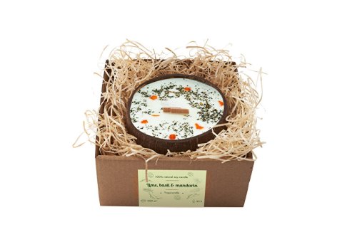 Svíčka z kokosu - vůně Limetka, bazalka & mandarinka - Sójové svíčky v kokosové skořápce jsou krásnou ozdobou a dekorací. Svíčky neobsahují parafín, který je vedlejším produktem ropného průmyslu. Spalováním parafínu se do vzduchu uvolňují nebezpečné toxiny, které potom vdechujeme. Svíčka obsahuje bavlněný knot, tedy čistě přírodní, bez obsahu boraxu, do kterého se jinak knoty namáčí, aby se uměle docílilo lepšího hoření. Do vosku přidáváme pouze kvalitní esenciální oleje z lokálních zdrojů. Svíčky jsou odlévány a zdobeny ručně. Každá se tedy od sebe trochu liší. Sojový vosk hoří přibližně dvakrát déle, než ten parafínový, u 100g vosku je to +- 20 hodin.