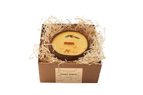Svíčka v kokosu - vůně pomeranč & mandarinka - Sójové svíčky v kokosové skořápce jsou krásnou ozdobou a dekorací. Svíčky neobsahují parafín, který je vedlejším produktem ropného průmyslu, jeho spalováním se do vzduchu uvolňují nebezpečné toxiny, které potom vdechujeme. Svíčka má dřevěný knot, který při hoření příjemně praská jako dřevo v krbu. Do vosku se přidávají pouze kvalitní esenciální oleje z lokálních zdrojů. Svíčky jsou odlévány a zdobeny ručně a z toho důvodu se od sebe může každá mírně lišit. Sojový vosk hoří přibližně dvakrát déle, než ten parafínový, u 100g vosku je to +- 20 hodin.