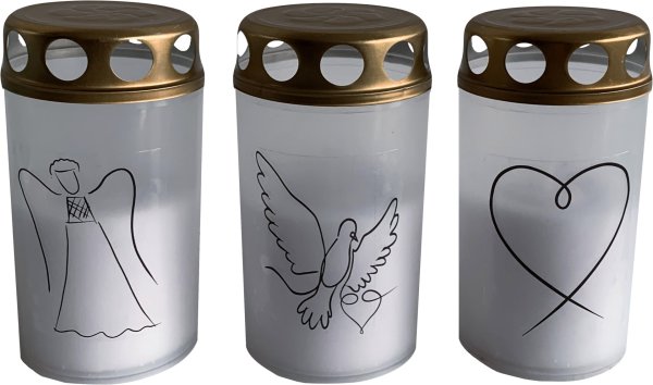 Svíčka určena na hřbitovy v plastovém bílém obalu. Její součástí je plechové víčko, které slouží jako ochrana před povětrnostními vlivy. Doba hoření až 25 hodin. Doba hoření závisí na klimatických podmínkách. Určeno pro venkovní použití. 3 motivy - mix v balení.