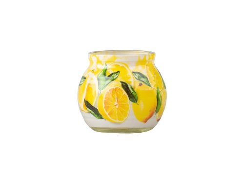 Vonná svíčka ve skle. Svíčka má svěží vůni citronu, které jsou vyobrazeny i na potisku. Je zabalená v papírové krabičce. Vhodná jako dárek. Hmotnost náplně: 70 g. Doba hoření: 18 hod. Rozměry: průměr 8 cm, výška 7 cm. Barva: žlutá.