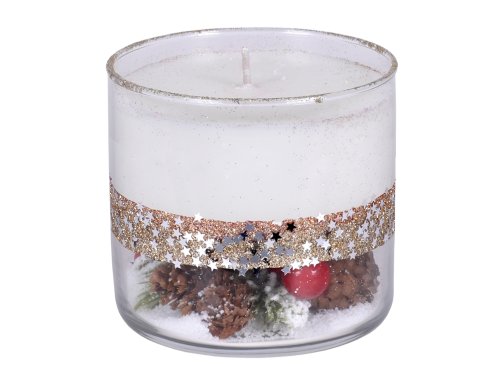 Vonná svíčka ve skle DUO CHRISTMAS TIME je dekorativní svíčka v čiré skleněné nádobě, kde horní část tvoří vosková náplň s knotem a spodní část je vyplněna vánočními ozdobnými prvky, které podtrhují slavnostní charakter. Díky kvalitnímu složení vosku a stabilnímu knotu hoří rovnoměrně a bez nadměrného kouře. Svíčka je vhodná jako stylový doplněk interiéru i jako vánoční dárek. Vůně vytváří příjemnou sváteční atmosféru. Hmotnost náplně: 270 g. Doba hoření: 33 hodin. Rozměry: průměr 8 cm, výška 10 cm. Barva: bílá.