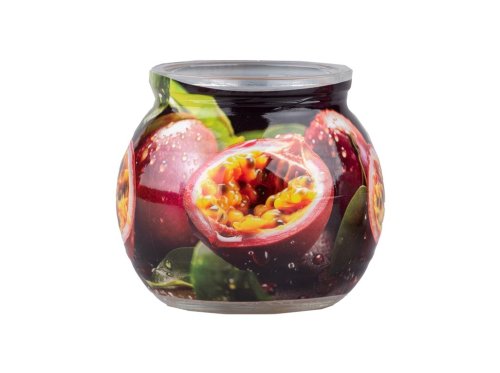 Vonná svíčka ve skle. Svíčka má ovocnou vůni mučenky, které jsou vyobrazeny i na potisku. Je zabalená v papírové krabičce. Vhodná jako dárek. Hmotnost náplně: 70 g. Doba hoření: 18 hod. Rozměry: průměr 8 cm, výška 7 cm. Barva: černá.