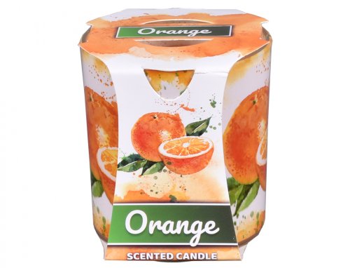 Vonná svíčka ve skle potažená fólií s dekorativním potiskem pomeranče, určená jako dekorace do bytu nebo jako dárek. Obsahuje éterické oleje a je vybavena knotem, který udržuje plamen stabilní. Voní po čerstvém pomeranči s jemně osvěžující a povzbuzující vůní, působí energizujícím dojmem. Hmotnost náplně: 80 g. Doba hoření: 18 hodin. Rozměry: délka 7 cm, šířka 7 cm, výška 7,6 cm. Barva: oranžová.