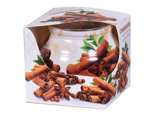 Parafínová hnědá svíčka s vůní skořice v baňaté kulaté skleničce s potiskem skořice. Velikost: d8 x 7,3 cm.