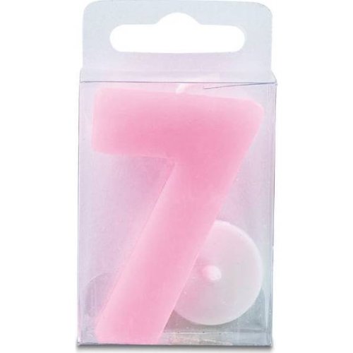 Svíčka ve tvaru číslice 7, růžová barva, výška 4 cm. Je vhodná především pro zdobení narozeninového dortu a podobných moučníků.