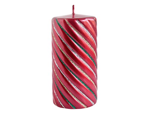Matná svíčka ve tvaru válce, s plochou hlavou, která je zdobená příčnými rýhami po celém obvodu. Rýhy jsou dozdobeny barevnými glitry. Interiér ozdobí sama osobě, a je vhodná i jako součást vazeb a dekorací. Ideální pro sezónu Vánoc a zimy. Doba hoření: 84 hodin. Rozměry: průměr 7 cm, výška 14 cm. Barva: červená.