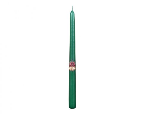 Kónická svíčka s reliéfním obrázkem zvonku na šerpě s mašlí a cesmíny. Barva: zelená. Výška: 30 cm.