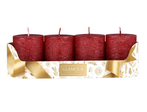 Rustikální adventní svíčky ve tvaru válce. Svíčky mají metalický povrch. Budou se vyjímat v moderním, dobovém i rustikálním interiéru. V balení jsou 4 kusy. Doba hoření: 21 hodin. Velikost svíčky: průměr 5cm, výška 6cm. Barva: červená.