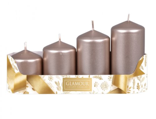 Sada adventních svíček stupňovitých. Mají tvar válce a plochou hlavu. Povrch svíčky je metalicky lesklý. Adventní věnec rozzáří. Doba hoření: 8-20 hodin. Rozměry: průměr 5 cm, výška 6/ 7,5/ 9/ 10,5 cm. V balení jsou 4 ks svíček. Barva: šampaň.