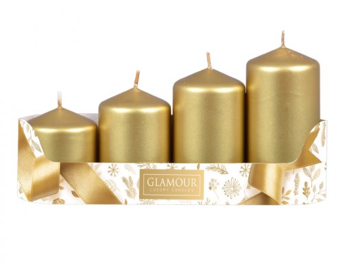 Sada adventních svíček stupňovitých. Mají tvar válce a plochou hlavu. Povrch svíčky je metalicky lesklý. Adventní věnec rozzáří. Doba hoření: 8-20 hodin. Rozměry: průměr 5 cm, výška 6/ 7,5/ 9/ 10,5 cm. V balení jsou 4 ks svíček. Barva: zlatá.