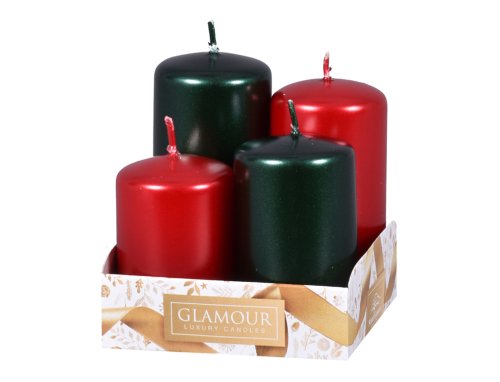 Adventní stupňovité svíčky v metalickém lesku s plochou hlavou. V tradičních barvách Vánoc. Rozměry: průměr 4 cm, výška: 6/7/8/9 cm. Doba hoření: 11/12,5/14,5/16,5 h. Materiál: parafín. Balení obsahuje 4 ks svíček. Barva: tmavě zelená, červená.