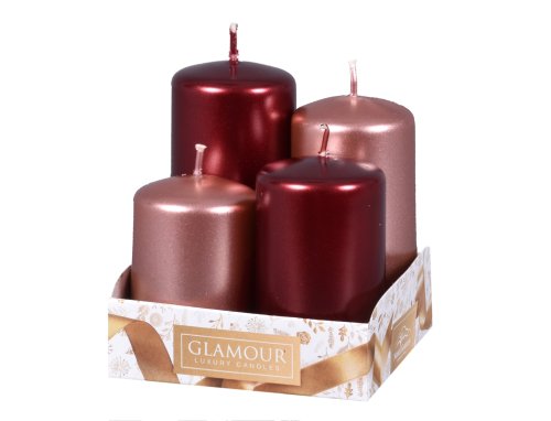Adventní stupňovité svíčky v metalickém lesku s plochou hlavou. V elegantní barevné kombinaci. Rozměry: průměr 4 cm, výška: 6/7/8/9 cm. Doba hoření: 11/12,5/14,5/16,5 h. Materiál: parafín. Balení obsahuje 4 ks svíček. Barva: bordó, růžová.