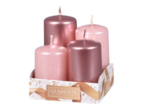 Adventní stupňovité svíčky v metalickém lesku s plochou hlavou. V něžné barevné kombinaci. Rozměry: průměr 4 cm, výška: 6/7/8/9 cm. Doba hoření: 11/12,5/14,5/16,5 h. Materiál: parafín. Balení obsahuje 4 ks svíček. Barva: světle růžová, růžová.