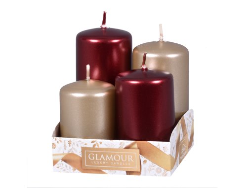 Adventní stupňovité svíčky v metalickém lesku s plochou hlavou. V tradičních barvách Vánoc. Rozměry: průměr 4 cm, výška: 6/7/8/9 cm. Doba hoření: 11/12,5/14,5/16,5 h. Materiál: parafín. Balení obsahuje 4 ks svíček. Barva: vínová, zlatá.