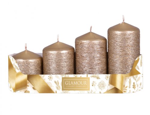 Sada adventních stupňovitých svíček ve tvaru válce, se špičatou hlavou. Mají povrch zdobený škrábáním. Jsou velice zdobné a elegantní. Rozměry: průměr 5 cm, výška 6/7,5/9/10,5 cm. Doba hoření: 22 hodin. Materiál: parafín. Sada obsahuje 4 ks svíček. Barva: měděná.