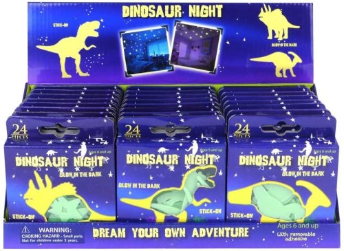Plastové dekorace na zeď zkrášlí pokoj každého milovníka pravěkých dinosaurů. Sada obsahuje 24 ks plastových dinosaurů, které po nasvícení svítí.