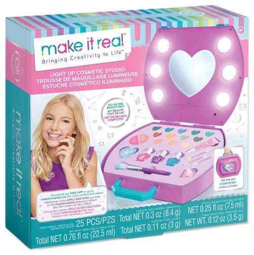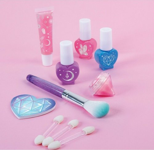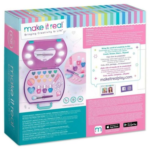 Obsahuje kosmetické pouzdro se světlem a zrcadlem, 12 různě barevných očních stínů, 3 štětce na oční stíny, 2 tvářenky, štětec na tvářenku, 3 různě barevné laky na nehty, lesk na rty, balzám na rty, pilník na nehty a instrukce. Vhodné pro děti od 8 let.