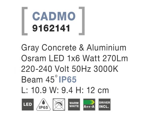 Svítidlo je vyrobeno z vysoce kvalitního hliníku a šedého betonu a je odolné proti tryskající vodě a prachu dle standardu IP65. Díky tomu je jeho životnost velmi dlouhá. Energeticky úsporná LED technologie navíc ušetří vaši peněženku.