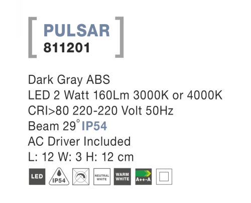 Nástěnné svítidlo Nova Luce PULSAR STEP GREY 4 bylo navrženo speciálně pro osvětlení venkovního schodiště, ale využití najde také na terase či zahradě. Díky ochrannému krytí IP54 proti přírodním vlivům je voděodolný a nevadí mu ani zaprášené prostředí. Futuristický design upoutá vaši pozornost i v prostředí vašeho domu či moderního bytu. Zpracování z vysoce kvalitního plastu ABS vám zaručí jeho spolehlivost po dlouhou dobu.