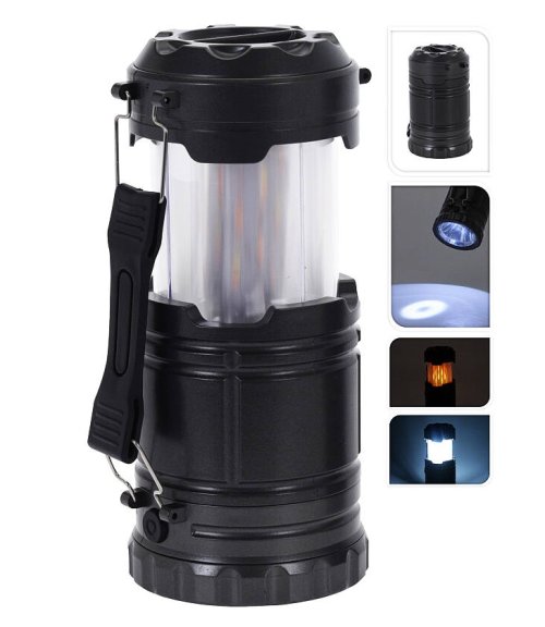 multifunkční svítilna s několika režimy- materiál: ABS plast- dvojí využití, jako stojící svítilna s 360° svícením, nebo klasická baterka- světelné režimy:- baterka se světlem v čele 75 Lumenů- 360° osvětlení při vysunutí, studená bílá 45 Lumenů- 360° osvětlení při vysunutí, teplá bílá efekt plamene 30 Lumenů- ideální na turistiku, camping, tábor, na chatu, atd.- průměr: 9 cm- výška: 14,5 cm- napájení: 3 x AA baterie (není součástí balení)- barva: černá