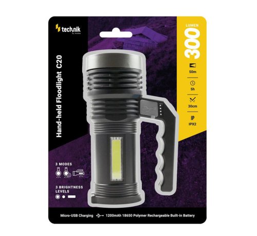 materiál: plast napájení: vestavěný akumulátor typ 18650 kapacita 2200 mAh nabíjení: USB kabelem (součástí balení) režimy: 100 %, 50 %, blikání, boční LED COB dosah: max. 50 m doba svícení: až 15 hod světelný tok: 300 / 100 lm svítivost: 8000 cd teplota světla: bílá stupeň krytí: IP44 odolná na pád z 1 m indikátor stavu nabíjení a kapacity baterie možnost uchycení: madlo, vertikální stojánek rozměry: 57 x 80 x 145 mm hmotnost: 144 g součástí balení: microUSB kabel barva: černá balení: blistr