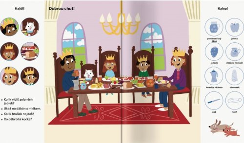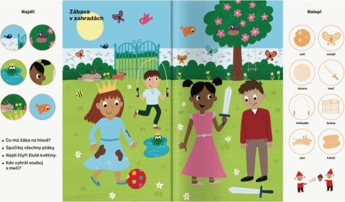 Nic nebaví děti tolik jako hledání obrázků a dolepování samolepek na stránky pracovního sešitu. V tomto sešitě si takové aktivity užije do sytosti - čeká jej totiž přes 101 obrázků. Některé bude nejprve hledat, další pak nalepí. Na každé dvojstraně objeví šatník princezny, královskou snídani, hraní v zahradách či procházku v lese. Při plnění úkolů a zodpovídání otázek se děti naučí, jak se co nazývá. Pomocí dolepování samolepek na správné místo si také procvičí jemnou motoriku.