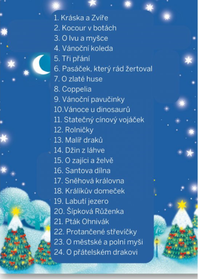 24 pohádkových příběhů klasické pohádky z tradičních lidových vyprávění příběhy od světově proslulých autorů jako H. Ch. Andersen nebo bratři Grimmové vánoční básně
