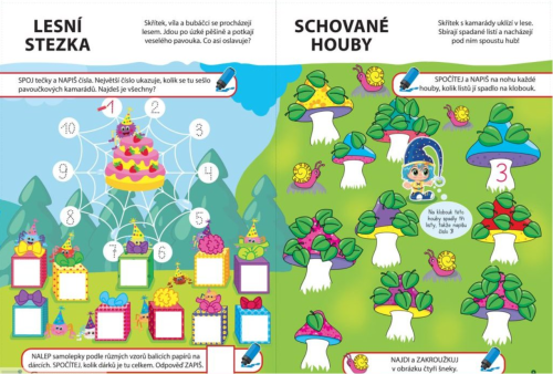 Vydej se za dobrodružstvím s vílou, skřítkem a dvěma veselími bubáčky! Navštívíš snový domeček a seznámíš se s čísly, která potřebují vybarvit. Popadni pastelky a tužku a připrav se, že budeš psát přímo na záda hadů, spočítáš sladkosti, dárečky i divoká zvířátka až z daleké Afriky! Tento sešit s množstvím samolepek podporuje jemnou motoriku, postupný rozvoj logického myšlení i matematické dovednosti a rozmanité aktivity napomohou s přípravou malých předškoláků.