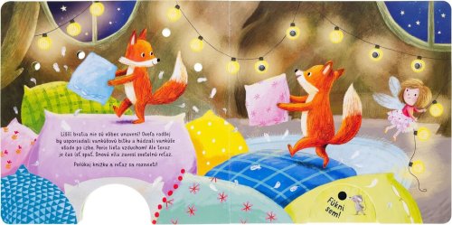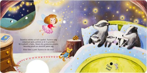 Foukni, rozsviť, počti si - fouknutím rozsviť světélka. Pro zvířátka je čas jít spát. Ale než se zavřou všechna očka, přiletí snová víla. Přifoukne Medvídkovi pěnu do koupele a hvězdný prach pro malé Jezevce. A měsíček? Snová víla mu svým fouknutím rozsvítí kamarádky na obloze - hvězdičky! Foukni na knížku a nechej také rozzářit světélka!