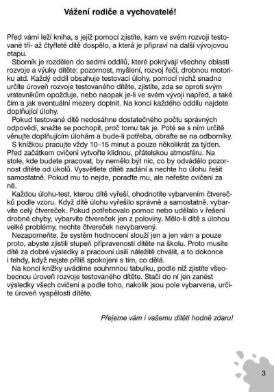 Nejkompletnější sborník testovacích úloh pro předškoláky, který připravili zkušení pedagogičtí pracovníci a psychologové. Prostřednictvím těchto testů snadno zjistíte úroveň rozvoje svého dítěte. Navíc můžete provést shrnutí všeho, čemu se Vaše dítě doposud naučilo, a připravit je na následující etapu, v níž je čekají složitější úlohy. Pokud testované dítě nezodpovědělo správně dostatečný počet úloh, nebuďte znepokojeni nebo rozladěni. Ke zlepšení obvykle postačí, budete-li dítěti trpělivě věnovat čas při řešení doplňujících úkolů, které jsou uvedeny na konci této knihy.