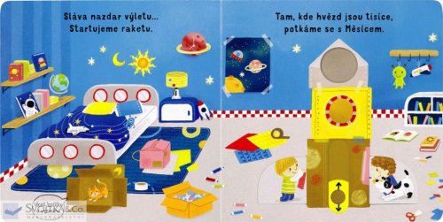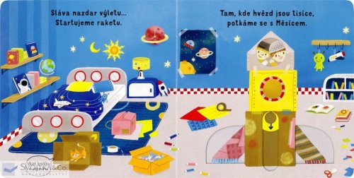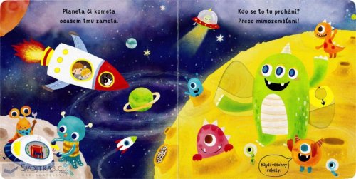 Sláva nazdar výletu, startujeme raketu. I ve vesmíru se toho dá hodně zažít, tak rychle otevři knížku! Sláva nazdar výletu, startujeme raketu. I ve vesmíru se toho dá hodně zažít! Toto dětské leporelo je určeno pro děti od jednoho roku. Má pevné stránky s posuvnými a otočnými prvky, a tak si dítě při prohlížení knížky současně procvičí jemnou motoriku – může na jednotlivých stránkách posouvat, tahat, otáčet. Objeví nové věci a můžete si o nich společně povídat. Kdo se to tu prohání? Přece mimozemšťani!