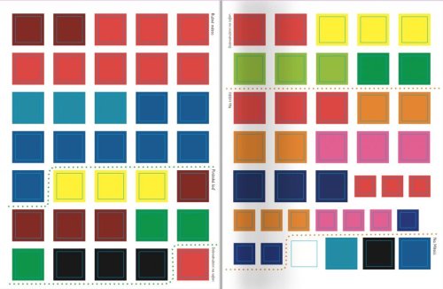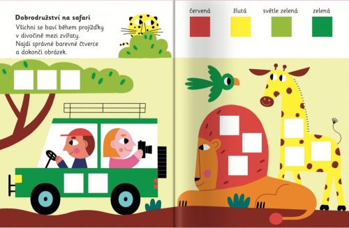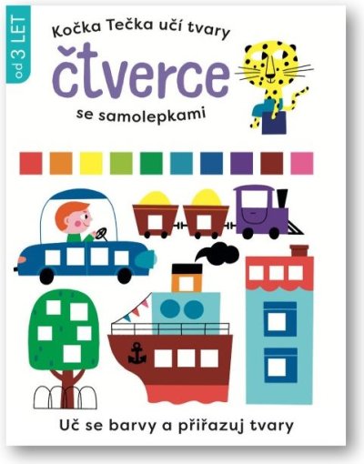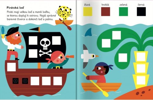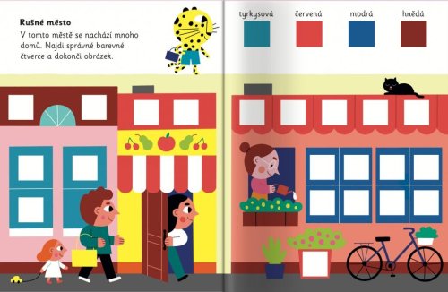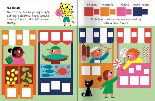 Tato hravá knížka vybízí děti, aby přiřazovaly barevné samolepky čtverců do obrázků.