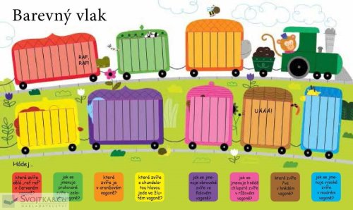 Jaké jsou základní barvy? Podívej se pod okénko! Odklop okénko a podívej se, kdo se veze v růžovém vagonu barevného vláčku! Podívej se za stromy jakou barvu mají zvířátka, která se tam schovávají? Najdi schované hračky v obchodě. Kolik jich je? Tato zábavná interaktivní knížka s více než 60 otevíracími okénky obsahuje ještě spoustu dalších zábavných cvičení, která pomáhají dětem naučit se poznávat barvy, pojmenovávat věci, dávat je dohromady a počítat do 5. Děti, které ještě neumějí číst, si o barvách mohou alespoň popovídat.