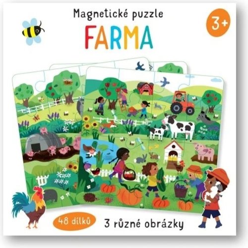 Tři různé magnetické skládačky zobrazují rušnou farmu se všemi jejími obyvateli a pilnými farmáři a farmářkami