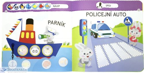 V této knížce najdou naši nejmenší malého zajíčka a plno snadných aktivit, které jim pomohou naučit se jednoduše a bez námahy rozeznávat dopravní prostředky. Nauč se poznávat dopravní prostředky! Auto, letadlo, loď znáš je všechny? Víš, jak vypadá taková sanitka a jaký má úkol? Podívej se na malého zajíčka čím cestuje a kam jede? Vše musíš ještě správně vybarvit, spojit a nalepit samolepky na ta správná místa. V této knížce se naši nejmenší seznámí s tím, co jezdí, létá a pluje, díky jednoduchým aktivitám nejen se samolepkami. Tak honem, pusť se společně s malým zajíčkem do učení!