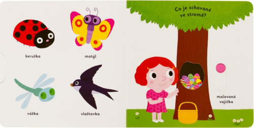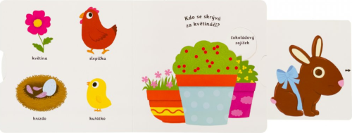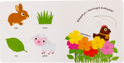 Do čeho si dáme vykoledovaná vajíčka? Kde se skrývá čokoládový zajíček? Stačí jen vložit prstík do správného otvoru, lehce vysunout, zatáhnout nebo otočit ve směru šipky a hned bude váš malý objevitel či objevitelka znát odpovědi. Leporelo je určeno pro nejmenší děti a má pevné stránky s posuvnými a otočnými prvky, a tak si naši nejmenší mohou při prohlížení a rozeznávání věcí spojených s Velikonocemi procvičit i jemnou motoriku. Knížka s prvky Montessori. České vydání publikace nakladatelství Nathan.