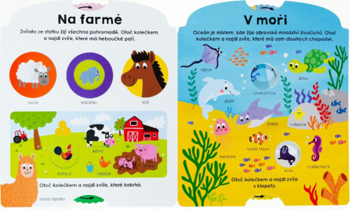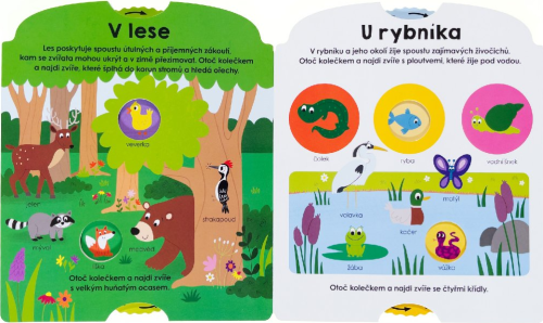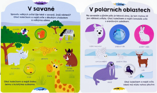 V této zábavné knize naleznete mnoho zvířat z celého světa a s otočnými kolečky si užijete jak mnoho zábavy, tak také procvičíte jemnou motoriku. Tato kniha je ideální pomůckou pro poznávání nejrůznějších zvířat, která jsou rozdělena podle prostředí, v němž žijí. Kniha obsahuje 4 otočná kolečka, čímž přispívá k procvičování jemné motoriky. Kolečka v sobě ukrývají spoustu dalších obrázků, a tak poznávání a učení se novým věcem bude ještě zábavnější! Počet stran: 10 Vazba: Leporelo s pohyblivými prvky ISBN: 978-80-256-3069-3 Ilustrační video
