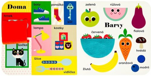 leporelo s plstěnými okénky a zrcátkem jasné barvy a hravé ilustrace procvičování motoriky