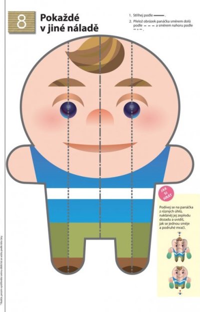 Pokud vaše dítě již úspěšně zvládlo pracovní sešity Stříhání a Nalepování, v tomto sešitě, který na ně přímo navazuje, získané dovednosti zužitkuje. Postupně vystřihne a slepí celkem 40 různých postaviček či předmětů. Hotové výtvory může posléze využít jako hračky, se kterými si užije spoustu zábavy. U každého předmětu najdete přesný postup a názornou ukázku, co vystřižená a slepená postavička umí nebo jak si s ní dále hrát. Buďte dítěti nápomocni, pokud si nebude vědět rady. Společně strávený čas při vytváření jednoduchých papírových modýlků bude pro dítě jistě báječným zážitkem. Výuková metoda Kumon je založena na tom, že dítě postupuje od jednoduché aktivity ke složitějším, a tak si postupně osvojí potřebnou dovednost - v tomto případě práci s nůžkami a lepidlem. Aktivní používání prstů a rukou pomůže dítěti rozvíjet jeho jemné motorické schopnosti a zlepšit činnost jeho mozku.