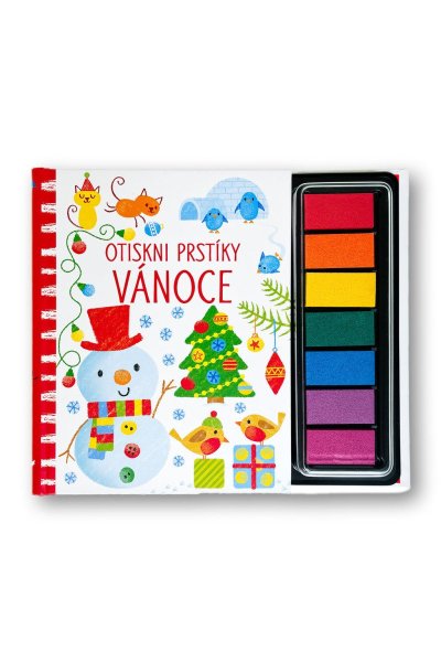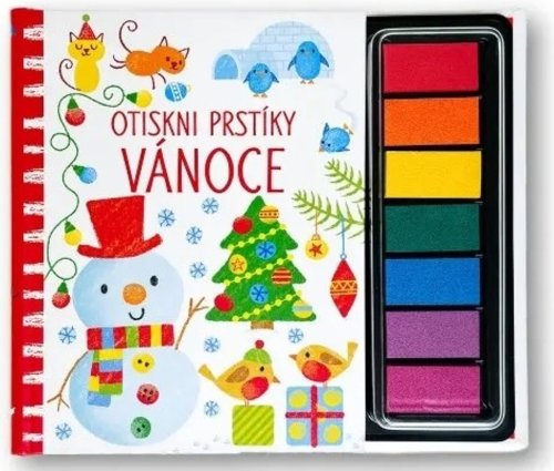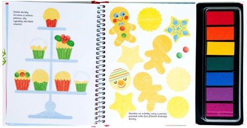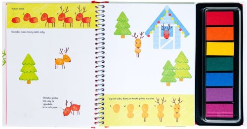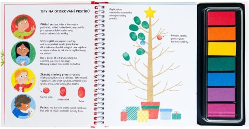 Dětská kniha překypuje nápady s vánoční tematikou na zábavné otiskování prstíků a nabízí dětem spoustu míst, která mohou zaplnit svými výtvory.