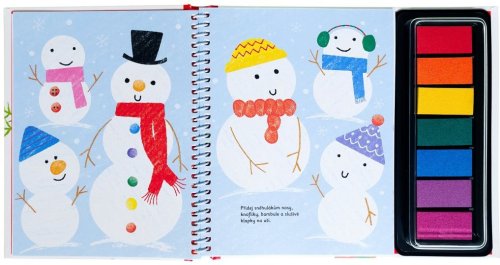 Stačí odklopit víčko z barevných inkoustových polštářků a pustit se do hrátek s otisky. K natisknutým prstíkům dokreslete vlastní detaily. Jak budou vypadat sněhové vločky? Jak dokončíte koulující se sněhuláky?