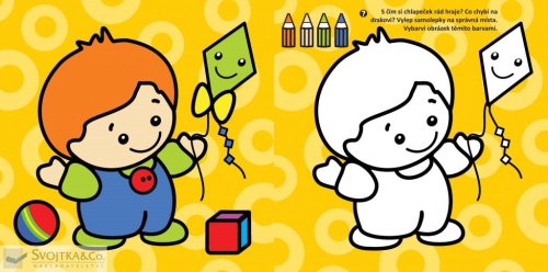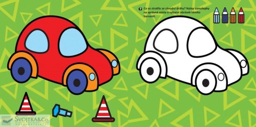 S čím si chlapeček rád hraje? Podívej se na předlohu, domaluj obrázek a dotvoř jej samolepkami. Co se během závodu ztratilo z auta? Vybarvi auto podle předlohy a dolep samolepky ztracených předmětů. Co chybí na obrázku s vrtulníkem? Vybarvi vrtulník podle předlohy, najdi a dotvoř obrázek samolepkami, které chybějí. Proč jsou tyhle mašinky různé? A co té vpravo chybí? Nalep samolepky na správná místa a vybarvi mašinku podle předlohy. Tyto a ještě další úkoly najdete v této knížce, která je určena pro nejmenší děti od 2 do 3 let. Hravou formou si zde procvičí ruku při domalování a ještě zjistí svou šikovnost a postřeh při plnění jednoduchých úkolů a při výběru a nalepování samolepek.