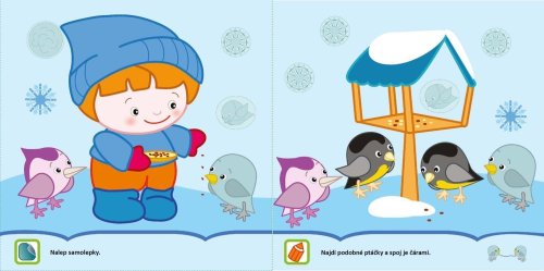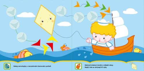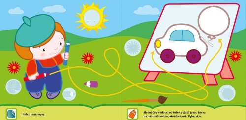 Kniha pro chlapečky od 2 do 3 let. Najdou v ní množství zábavných úkolů a ještě zjistí svou šikovnost při výběru a nalepování samolepek. Spoj tečky ve směru šipek a dokonči obrázky. Najdi podobné ptáčky a spoj je čarami. Nalep samolepky tak, aby se cestující dívali ve směru letu. Nalep samolepky v naznačeném barevném pořadí. Sleduj čáry vedoucí od tužek a zjisti, jakou barvu by mělo mít auto a jakou balonek. Tyto a mnohé další úkoly najdete v této knížce, která je určena pro chlapečky od 2 do 3 let. Nejenže se s touto knížkou zabaví, ale ještě zjistí svou šikovnost a postřeh při výběru a nalepování samolepek.