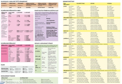 Anglická gramatika v kostce i tak lze nazvat tento stručný, ucelený a přehledně uspořádaný souhrn anglické gramatiky. Počínaje abecedou, předložkami in, on, at, základními a řadovými číslovkami a znaky pro přepis anglické výslovnosti přes dny v týdnu, měsíce, uvádění času, data, roční období, ale i výrazy pro množství, množné číslo podstatných jmen, členy, osobní a přivlastňovací zájmena a nejužívanější frázová slovesa, vztažná a tázací zájmena až po stupňování, časování, způsobová a nepravidelná slova, podmiňovací způsob a mnoho dalšího. Zkrátka zde naleznete vše, co je pro osvojení gramatiky anglického jazyka nezbytné. Jednotlivé informace jsou přehledně uspořádány a gramatické jevy uvedeny na příkladech tak, abyste měli při studiu angličtiny vždy po ruce pohotového a užitečného pomocníka.