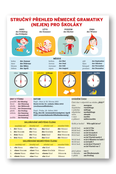 Tato učební pomůcka nesmí chybět v žádné školní aktovce. Ucelený přehled německé gramatiky je vhodný jak pro studenty základních a středních škol, tak pro samouky a pro každého, kdo potřebuje mít gramatická pravidla přehledně na jednom místě. Členění podle slovních druhů. Obsahuje kapitoly o jednotlivých slovních druzích, určování rodu podstatných jmen, používání členů, skloňování přídavných jmen, seznam nepravidelných sloves, určování času, větný rámec a slovosled ve větě, zápor a mnoho dalšího. Vše přehledně v tabulkách.
