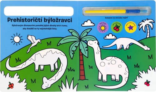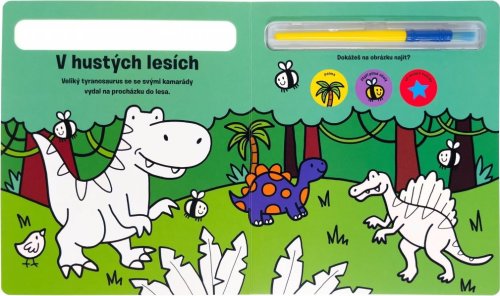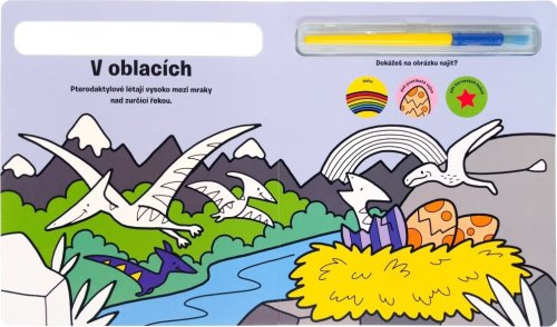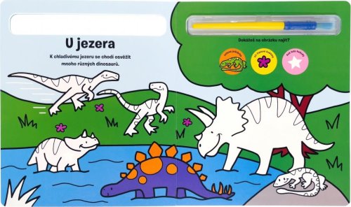 Knížka s pevnými stránkami je plná obrázků dinosaurů, které jsou částečně barevné. Bílé části lze velice snadno vybarvit - stačí namočit štětec, který je součástí knihy, do vody a barva se jako zázrakem na bílém podkladě objeví. To ale není všechno! Vymalovaný obrázek jako kouzlem zmizí, a tak jej dítě může vymalovávat stále dokola. Zkontrolujte, zda dítě drží štětec správně. S touto knížkou si bude procvičovat jemné motorické schopnosti a koordinaci oka a ruky.