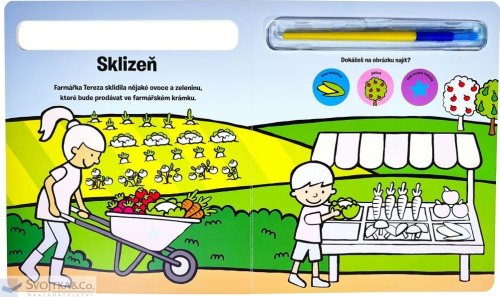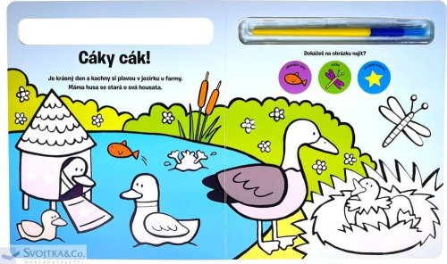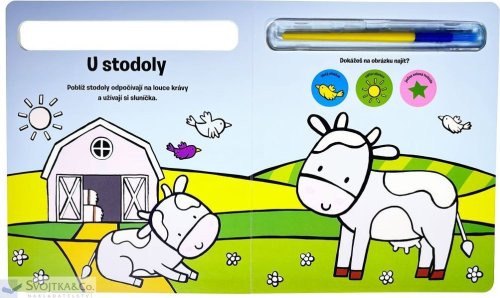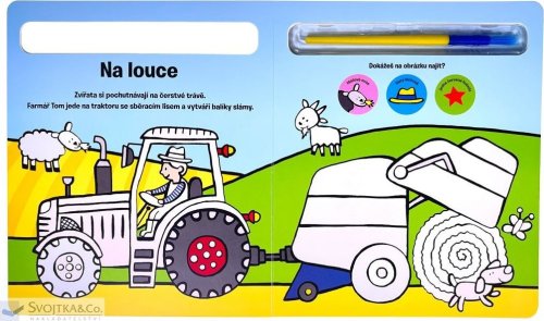 Knížka s pevnými stránkami je plná obrázků z prostředí farmy, které jsou částečně barevné. Bílé části lze velice snadno vybarvit - stačí namočit štětec, který je součástí knihy, do vody a barva se jako zázrakem na bílém podkladě objeví. To ale není všechno! Vymalovaný obrázek jako kouzlem zmizí, a tak jej dítě může vymalovávat stále dokola. Zkontrolujte, zda dítě drží štětec správně. S touto knížkou si bude procvičovat jemné motorické schopnosti a koordinaci oka a ruky.