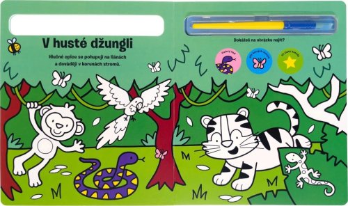 Knížka s pevnými stránkami je plná obrázků zvířat, které jsou částečně barevné. Bílé části lze velice snadno vybarvit - stačí namočit štětec, který je součástí knihy, do vody a barva se jako zázrakem na bílém podkladě objeví. To ale není všechno! Vymalovaný obrázek jako kouzlem zmizí, a tak jej dítě může vymalovávat stále dokola. Zkontrolujte, zda dítě drží štětec správně. S touto knížkou si bude procvičovat jemné motorické schopnosti a koordinaci oka a ruky.