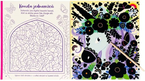Uvnitř této knížky najdeš obrázky s jednorožci na vyškrabávání, ale také úkoly, hádanky a další aktivity s těmito magickými tvory.