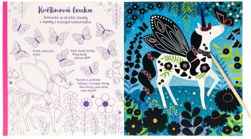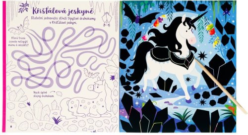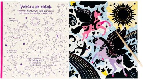 Použij dřevěné škrabátko, pomocí kterého odhalíš barevné obrázky s kouzelnými jednorožci a můžeš se i umělecky vyjádřit. Užij si také spoustu zábavy s hádankami a úkoly. Hledej rozdíly, pomoz netopýří mámě najít cestu k jejímu mláděti nebo najdi jednorožčí královnu. Pokud v některých aktivitách tápeš, na konci knížky nalezneš správné odpovědi. Procvič si jemnou motoriku, koordinaci oka a ruky a popusť uzdu své fantazii.
